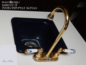 今では北米でも珍しくなった金色のクラシック・デザインですが、ハンドル・レバーの白磁も輸入住宅らしい感じを出しています。