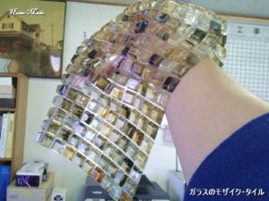 薄い透明なシートに張られたガラスのモザイク・タイルを手でかざしてみました。