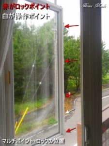 このサッシには、マルチロックという機能が付いていて、1ヶ所で操作すると4ヶ所の位置でロックが掛かります。