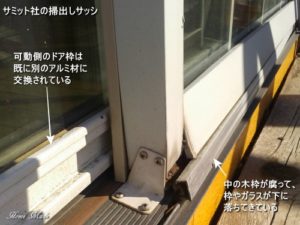 輸入のペアガラスは強化ガラスで出来ていますから、相当の重量があります。その重さに腐った木枠が耐えられず、ガラスが下に下がってきて屋外側のアルミ枠を外へ押し出した格好です。