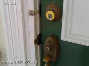 ここの玄関ドアに付いているハンドルセットは、クイックセット(Kwikset、旧Titan)の古い製品で、デッドロック以外にハンドルにも鍵が付けられています。