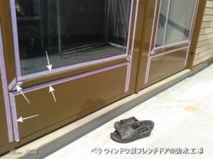 こちらは、ペラ(Pella)ウィンドウのフレンチドア(観音開きの2枚ドア)ですが、アルミの外装板がいくつもに分かれて装着されている為、弱点となるつなぎ目が多数存在します。