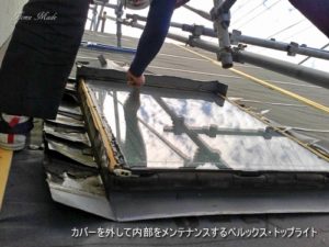 こちらの写真は、ハメ殺しのベルックス(Velux)・トップライトをメンテナンスしている作業風景です。