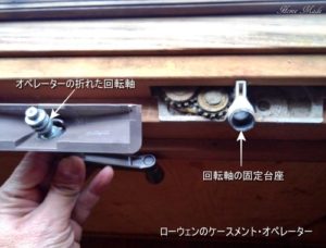 お客様の多くは、写真のような状況を見て、クランクハンドルが壊れたというふうに思われるようですが、この不具合はオペレーターに付いている鋳物の回転軸が折れて、ハンドルと一緒に外れてしまっただけなのです。